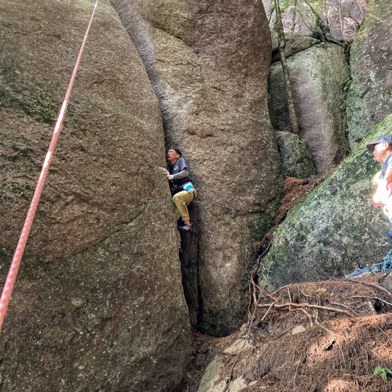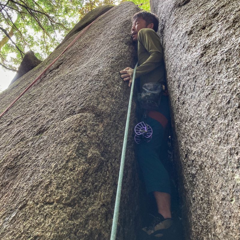 まずkwtさんが一番乗りで「キャップロック」にオンサイトトライをしたら、クラックの中はやっぱり濡れていたみたいですが、そんなことはものともせずにkwtさんは登り続け、途中で一度フットジャムが外れながらも、驚異的な土俵際の粘りを見せて持ち直し、最後は全身のフリクションを余すところなく使ってオンサイト。