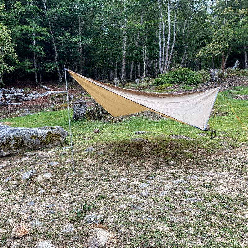 「スケアクロウ」も「森の緑にかこまれて」も登れて僕は大満足だったので、雨が降る前に撤収することにしてキャンプ場に戻り、こないだの沢でのタープ泊用に買った小さいタープを張りました。