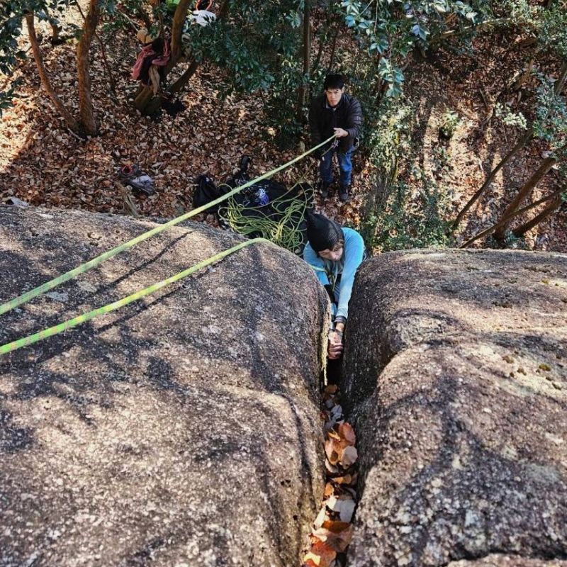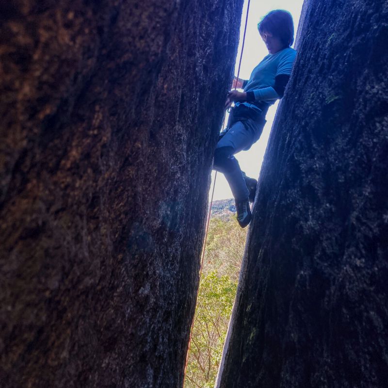 Kさんは初めてのワイドクラックということなので、まず「ひばりチムニー」(5.7)を登ってトップロープを張ることにしました。