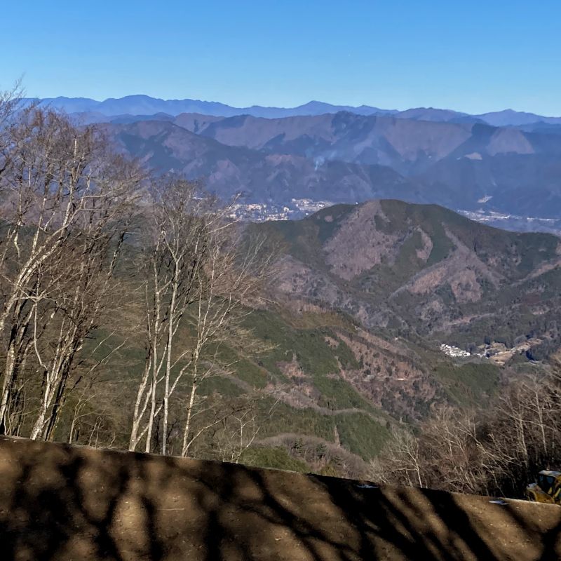 稜線を歩いている間、右側にはずっと秋山山稜が見えていますが、秋山山稜のさらに向こうの山から煙が出ているのが見えます。